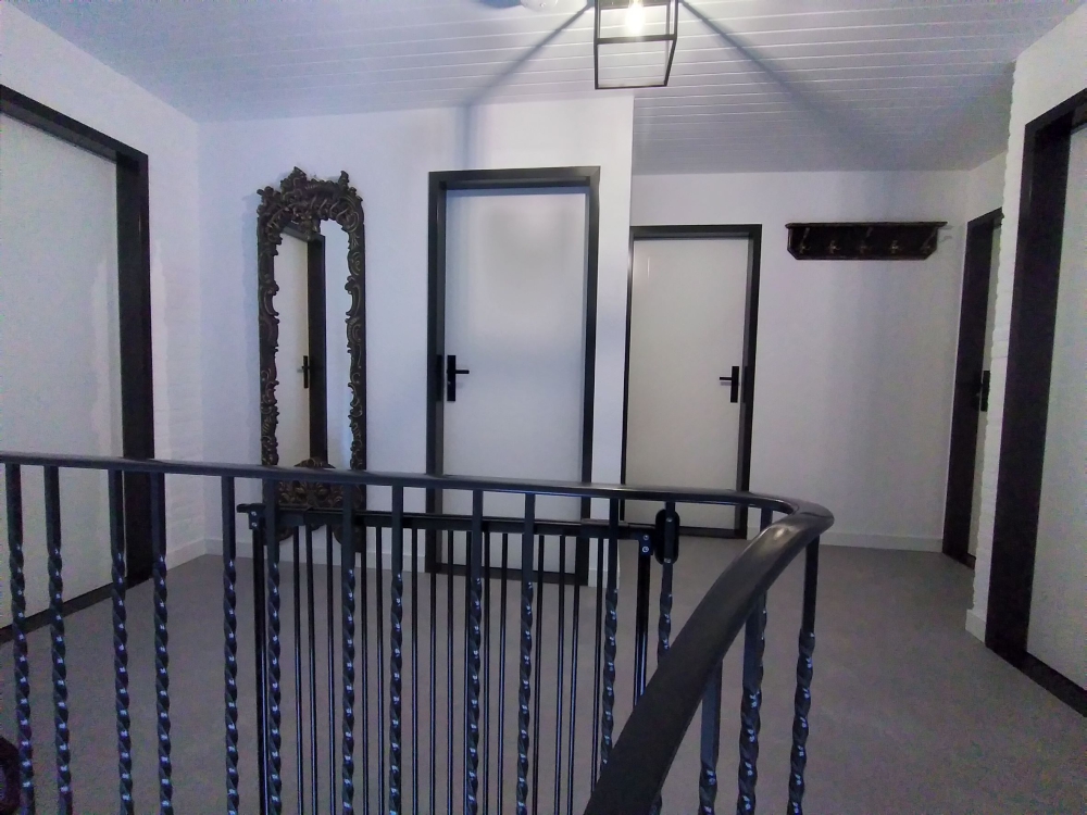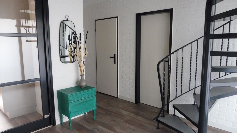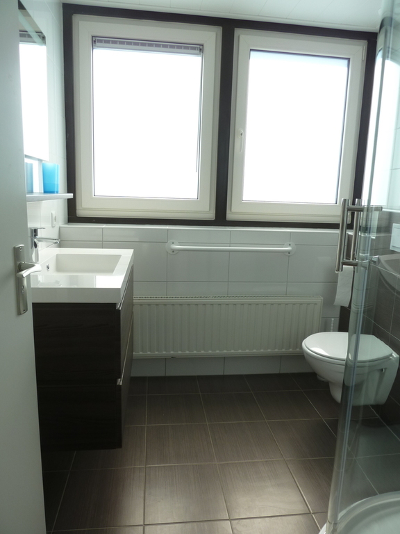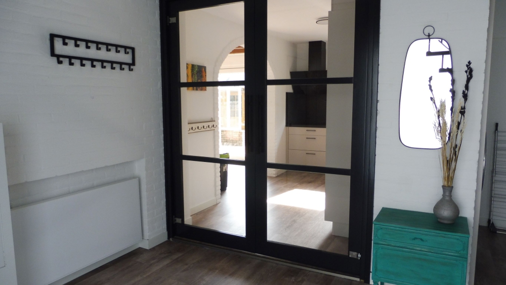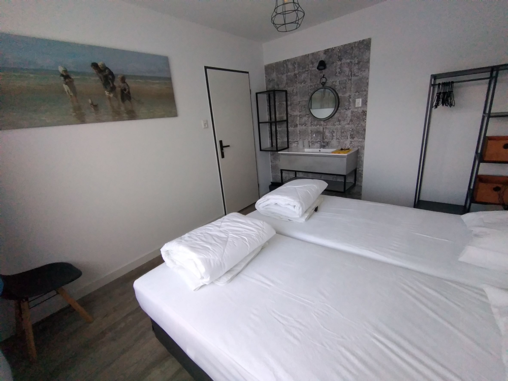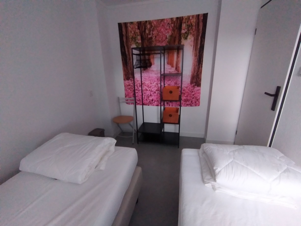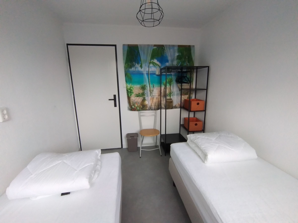 Grote hal, 1 slaapkamer met 2 boxspring bedden en 1 badkamer met douche en toilet.