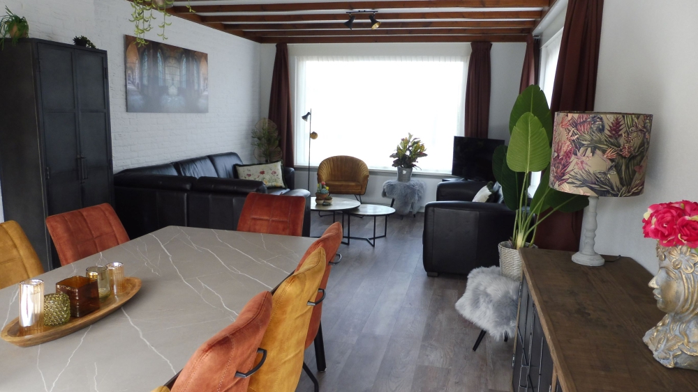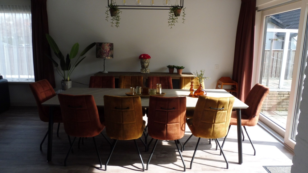 Begane grond: Woonkamer met eethoek voor 10 personen en vloerverwarming.