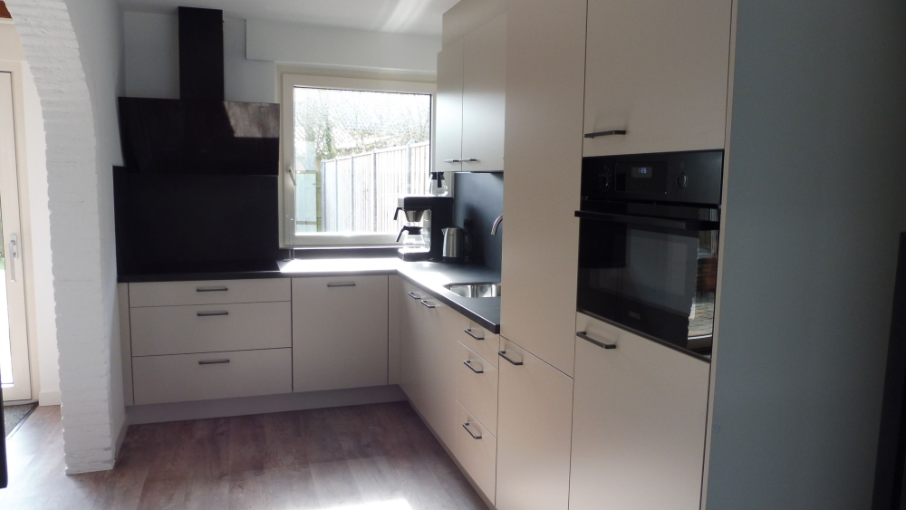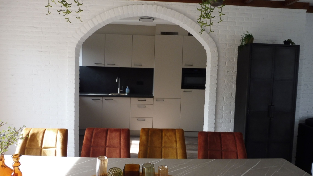 Open keuken met vaatwasser, combi magnetron, koelkast, vriezer en wasmachine.