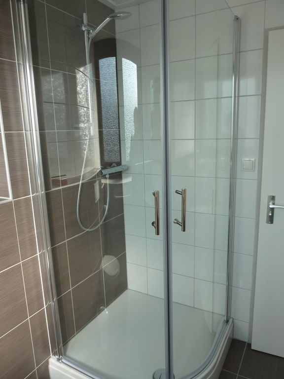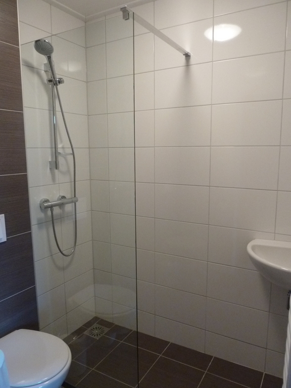 badkamer met douche en toilet.